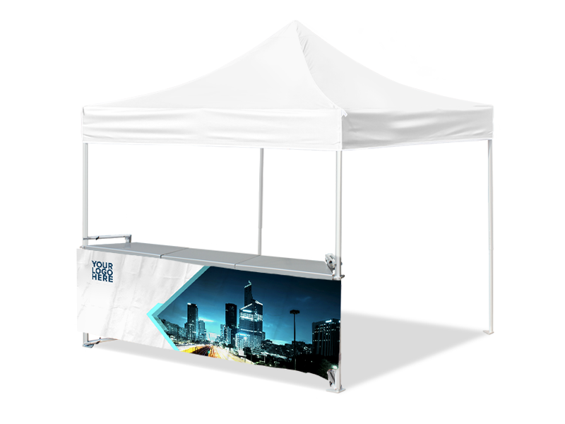 This 10′ single sided and full dye sublimated counter fabric is compatible with our V3 Canopy frame only. Featuring 2″ Hexagonal Legs diameter with 2 mm thickness for anti-shock resistance and longer durability, this counter frame is stable enough to withstand heavy winds and harsh weather conditions. The counter top can holds up to 100Lbs and can be used to serve food and beverage or to showcase products. The 600 Denier polyester fabric is flame retardant and water resistant which makes it perfect for any outdoor or indoor event. Promote your brand by customizing your counter fabric with any logo or unique design of your choice, and give your canopy booth an outstanding look!