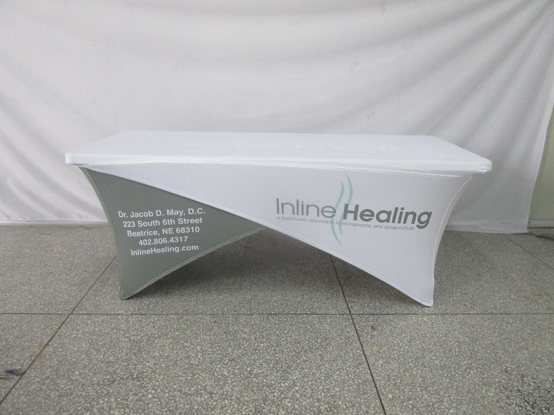 Give a striking new presentation to any booth with this custom cross-over stretch table cover. This sleek and modern table cover is ideal for trade shows, sporting competitions, promotional events, school events, fundraisers table and many more.