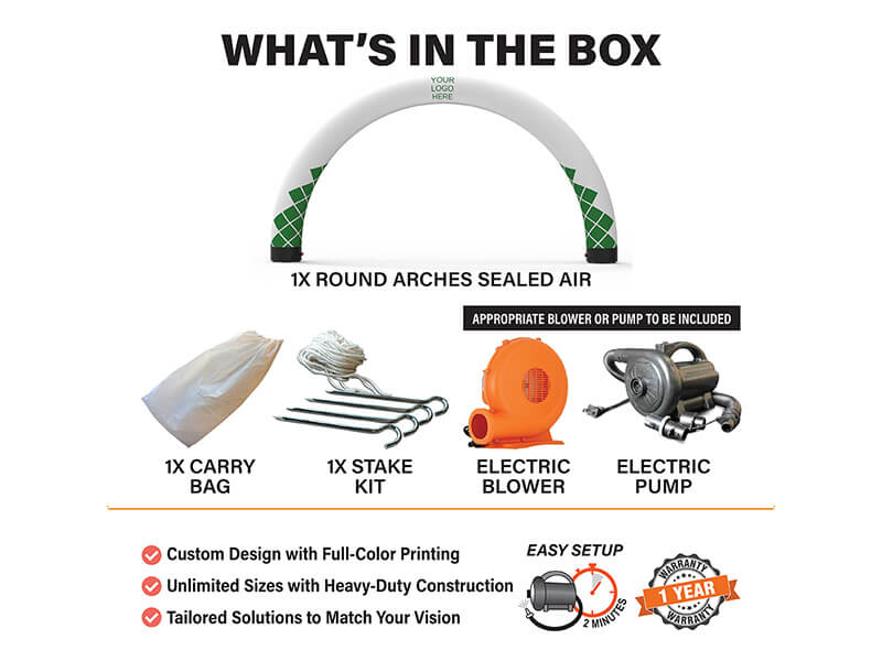 🔥Spring Event Promo: Premium Entrance. This inflatable round arch inflates in just minutes with its internal air blower that will continuously run air through it. Our arches are completely customizable and regardless of the shape and size of your display, there are no limits to your design and logo requests. The ultra resistant Dacron composition makes the arch suitable for any type of terrain.