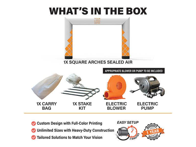 🔥Spring Event Promo: Premium Entrance. This inflatable square arch inflates in just minutes with its internal air blower that will continuously run air through it. Our arches are completely customizable and regardless of the shape and size of your display, there are no limits to your design and logo requests. The ultra resistant Dacron composition makes the arch suitable for any type of terrain.